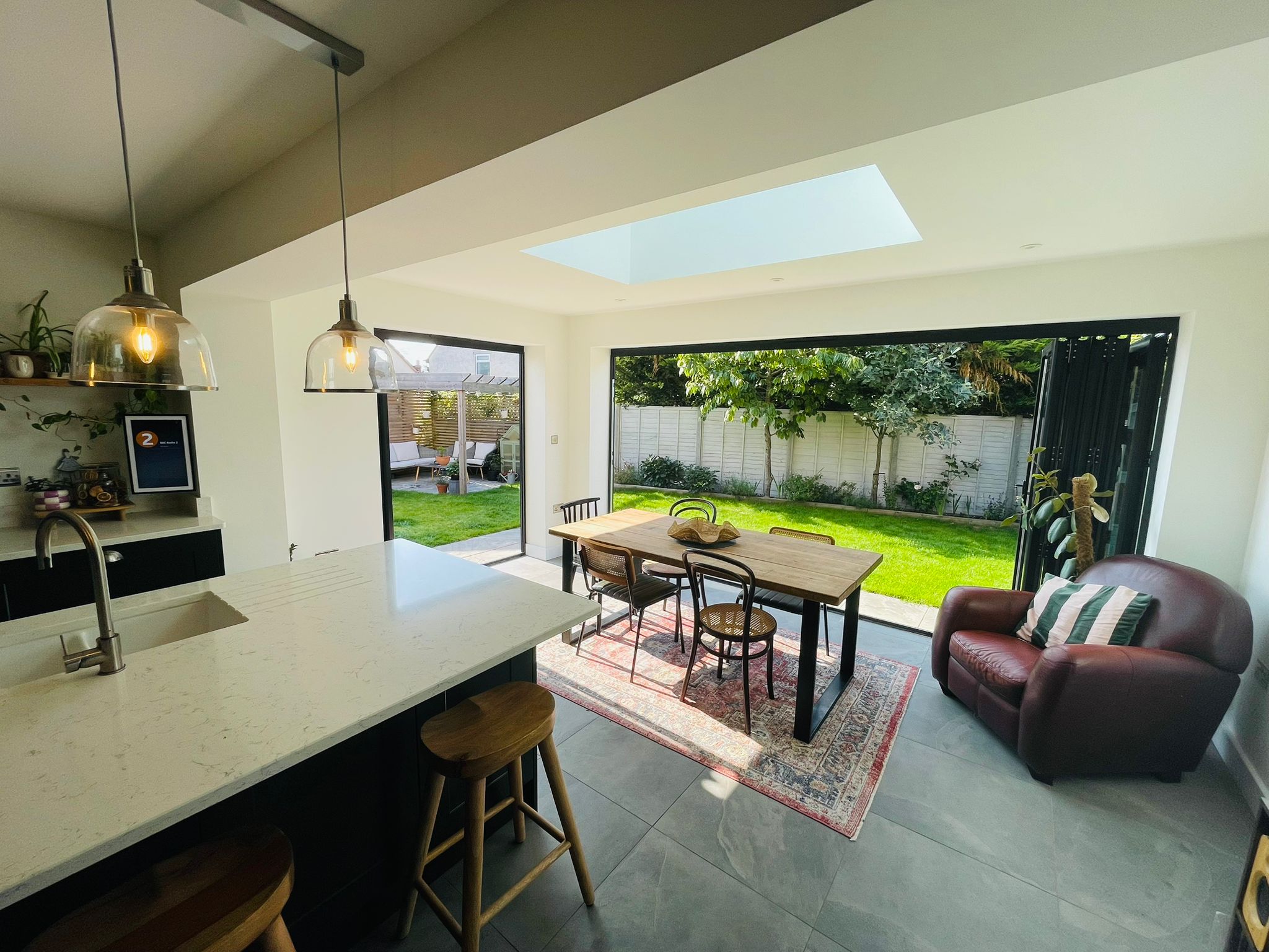 On the side, a two-pane SMART aluminium bifold door was fitted to add flexibility and improve access to the patio area. This smaller opening ensures consistent style across the structure and improves the room’s functionality, providing multiple access points and additional airflow when needed. SMART bifold doors can come in arange of different colours allowing the homeowner to choose the right option for them and their home enabling the design to fit into their overall vision for their home improvement.